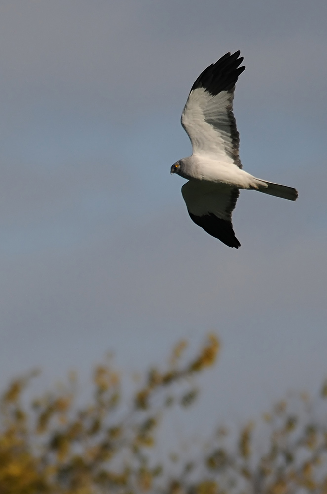 ハイイロチュウヒの♂は肉眼で見てもよ~く目立ちます。
